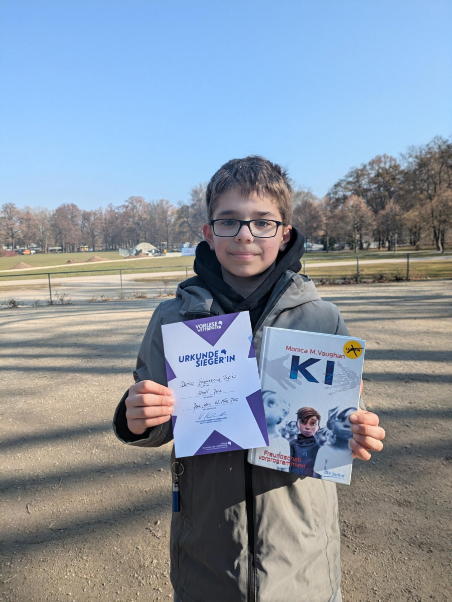 Am Montag, dem 2.3.2026, präsentierten in der Ernst-Abbe-Bücherei Jena die jeweiligen Sieger*innen ihrer Schulen stellten ihr Können vor einem aufmerksamen Publikum unter Beweis und und die Jury vor eine schwierige Wahl. Die Teilnehmenden lasen zunächst aus einem selbst gewählten Buch. Dabei mussten sie nicht nur den Text fehlerfrei vortragen, sondern auch Ausdruck, Betonung und Interpretation überzeugend gestalten. Im zweiten Teil folgte traditionell ein unbekannter Text, der spontan vorgelesen werden musste. Darius ragte unter ihnen hinsichtlich Textauswahl, klare Aussprache und lebendige Interpretation heraus und erhielt eine Urkunde sowie einen Buchpreis.