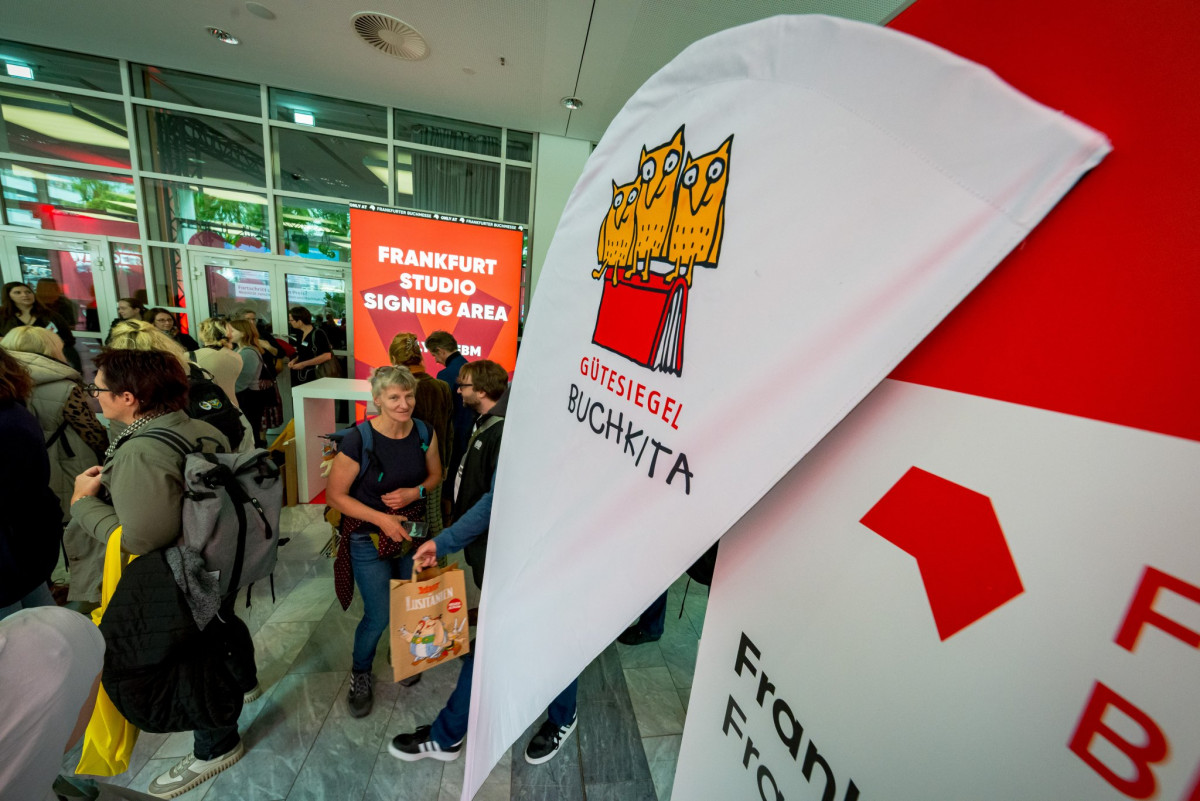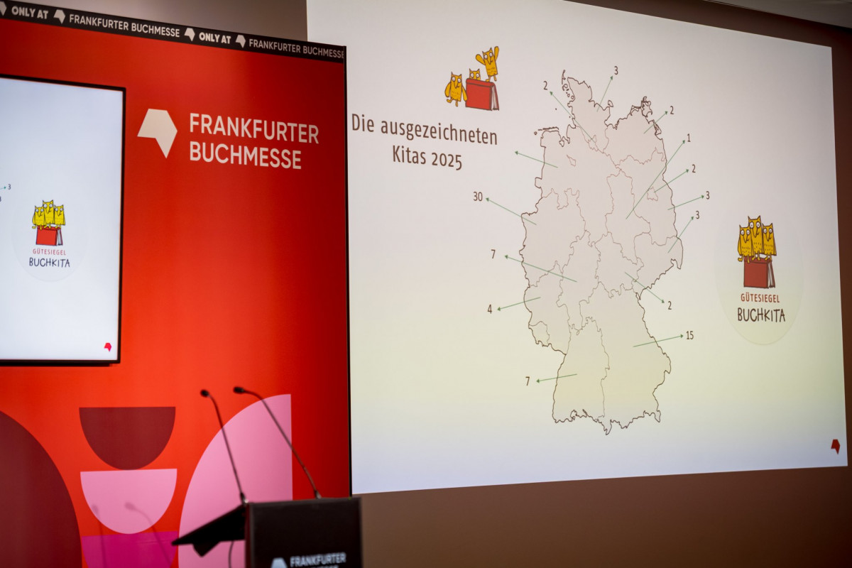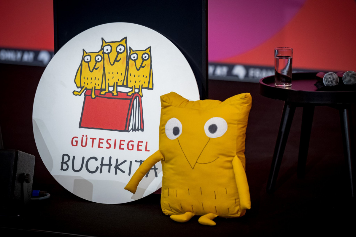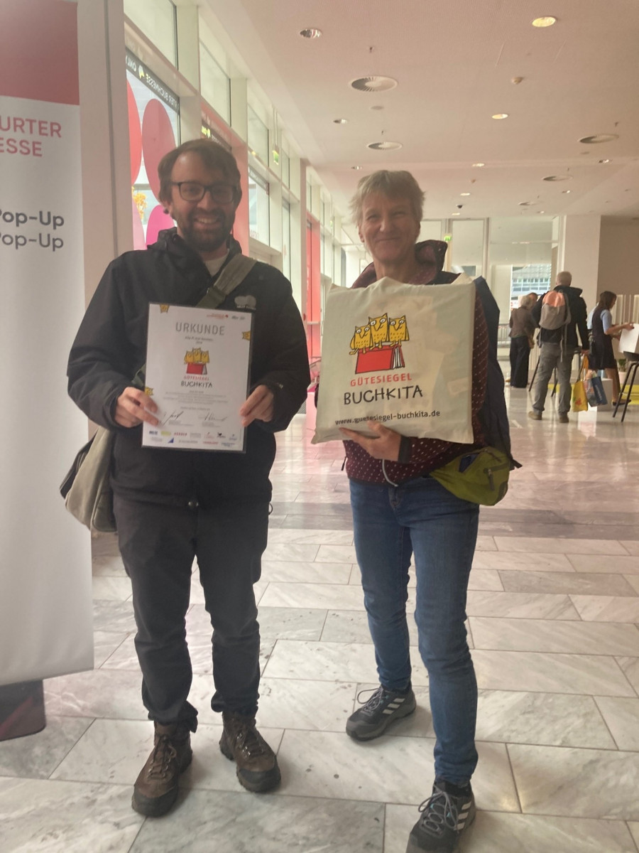 All das qualifiziert den Pi mal Daumen als Buch-Kita! Das Siegel nahmen Yannick Weiser und Astrid Jahns stellvertretend für das Team am 17.10. in Frankfurt entgegen. »Die Preisverleihung war sehr wertschätzend, der Moderator und die Jurymitglieder auf der Bühne haben uns wirklich ein gutes Gefühl vermittelt! Es wurde gelobt, dass wir es neben unserer »eigentlichen« Arbeit noch geschafft haben, die hohen Kriterien für die Bewerbung zu erfüllen. Das hat uns sehr stolz gemacht.« Fasst Yannick die Preisverleihung zusammen. Dort gab es eine Verlagsführung für alle Kita-Vertreter*innen und ein tolles Buchpaket.