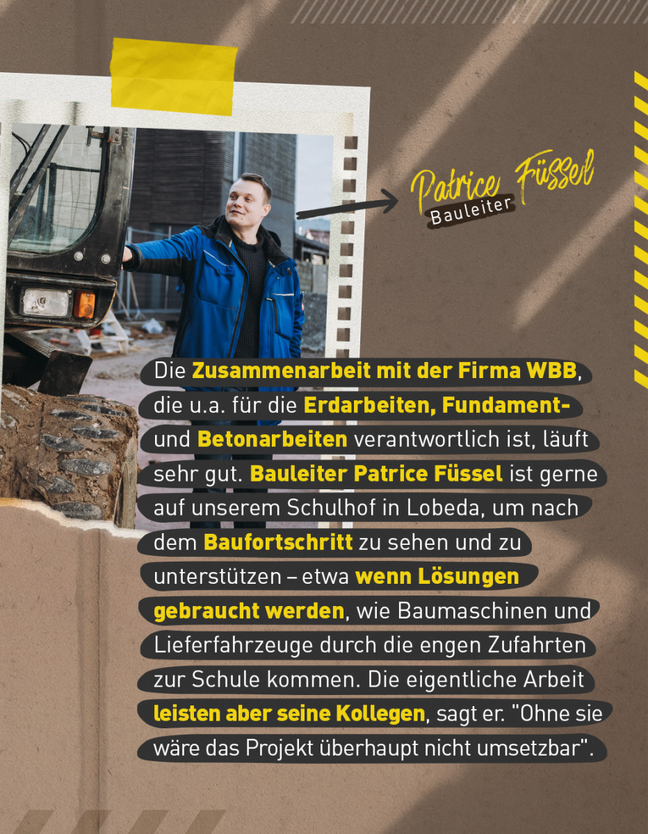 Die Zusammenarbeit mit der Firma WBB, die u.a. für die Erdarbeiten, Fundament- und Betonarbeiten verantwortlich ist, läuft sehr gut. Bauleiter Patrice Füssel ist gerne auf unserem Schulhof in Lobeda, um nach dem Baufortschritt zu sehen und zu unterstützen – etwa wenn Lösungen gebraucht werden, wie Baumaschinen und Lieferfahrzeuge durch die engen Zufahrten zur Schule kommen. Aber vor allem ohne seine Kollegen vor Ort »wäre das Projekt überhaupt nicht umsetzbar«, sagt er.