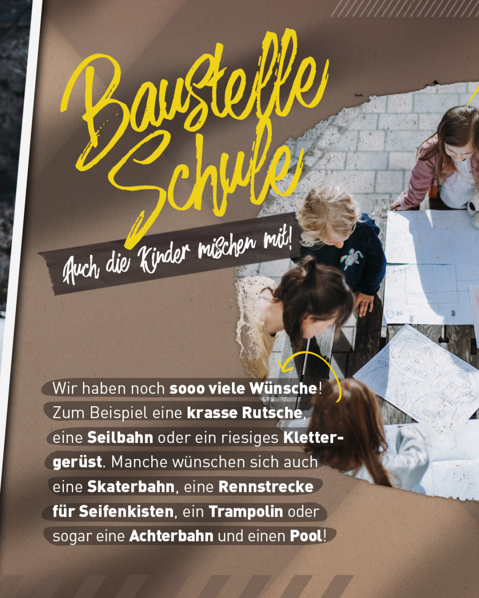 Aber nicht nur die Bauarbeiter haben aktuell fleißig zu tun in Lobeda. Auch die Kinder bringen sich ein. Sie haben z.B. schon eine Zeitkapsel zusammengestellt und Ideen zur Neugestaltung zu Papier gebracht. Und noch mehr Wünsche schwirren in ihren Köpfen herum: »Eine krasse Rutsche«, »Eine Seilbahn«, »Ein rieeeeesiges Klettergerüst«, »Eine Skaterbahn«, »Eine Rennbahn für Seifenkisten«, »Ein Trampolin«, »Eine Achterbahn«, »Ein Pool«. Glücklich sind sie darüber, dass zusammen mit der Schulleitung für den gefällten Baum eine Lösung gefunden wurde: Ein neuer Baum wird gemeinsam im Wald gepflanzt.