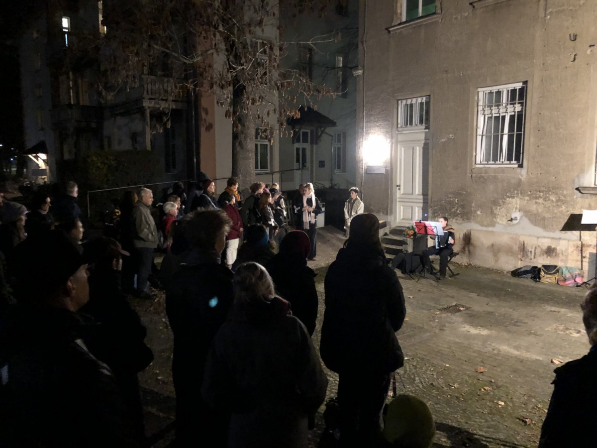 Am 9.11., zum jährlichen Klang der Stolpersteine, bei dem auch parallel zwei Schüler*innengruppen des 11. Jahrgangs zwei Stolpersteine in der Neugasse begleiteten, fand daher erstmal ohne Tafel eine Aktion an ebendiesem Ort statt. Im nächsten Schritt soll diese dann realisiert und angebracht werden.