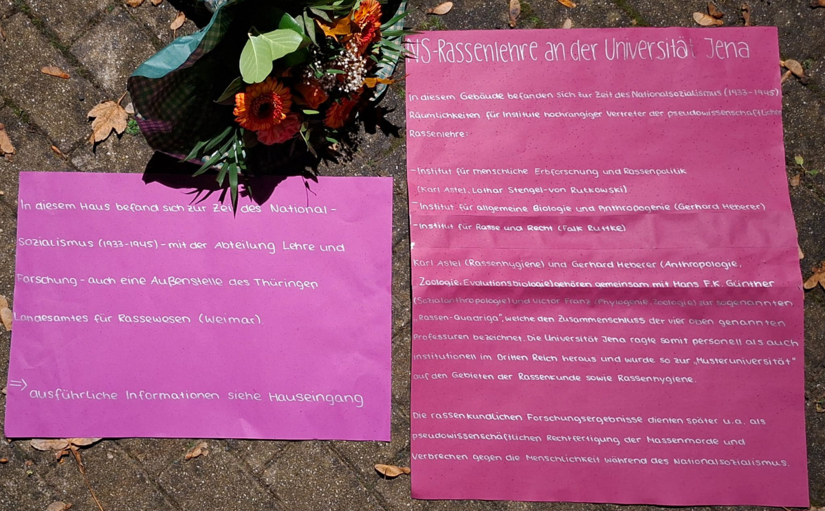 Die Aufgabe des Jenaer Institutes an der Kahlaischen Straße 1 bestand in Kooperation mit dem Landesamt in Weimar vor allem darin, alle notwendigen erbbiologischen, bevölkerungs- und rassenpolitischen »Gesetze, Maßnahmen und Methoden weltanschaulich, wissenschaftlich und politisch als zentrale Stelle zu unterstützen und durchzuführen, gegebenenfalls auch vorzubereiten und zu erproben, zu verbessern und neu zu ersinnen«, schreibt der Jenaer Prof. Dr. Uwe Hoßfeld von der Uni Jena. An diesen ist Victoria Lorenz, Fachlehrerin für Geschichte des 11. Jahrgang der UniverSaale, gemeinsam mit den Schüler*innen herangetreten, um wissenschaftliche Begleitung für die Erstellung einer Gedenktafel an der Kahlaischen Straße zu erhalten.