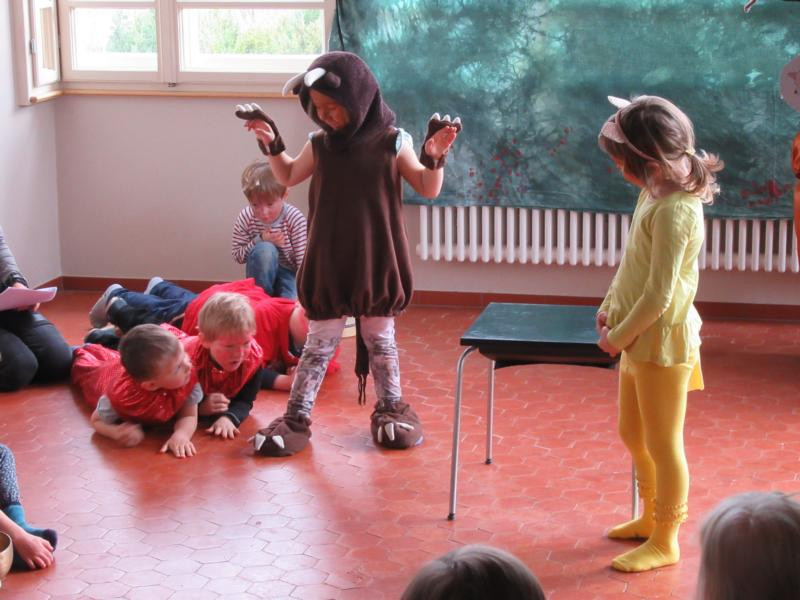 Am Donnerstag, den 30.März 2017 war es am Nachmittag soweit. „Der Grüffelo“ wurde von den Kindern als Theaterstück in der Rosenthal Villa aufgeführt. Wochenlang haben die Kinder geprobt, Texte gelernt, Kostüme genäht, Requisiten bemalt, Grüffelo Grütze gekocht und natürlich Grüffelo Schlangen gegessen. Mit viel Aufregung und Spaß wurde das von den Kindern der Jupiter Gruppe aufgeführte Theaterstück ein großer Erfolg. Im Anschluss daran wurden alle Eltern und Schauspieler_innen zur Grüffelo Grütze und Butterbrot mit kleiner Maus in den Garten unserer Kita eingeladen.