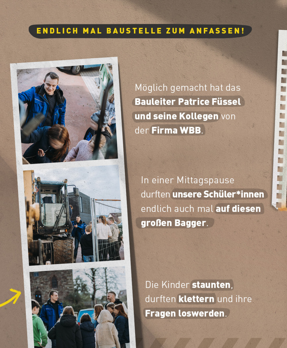 Die Schülersprecher*innen erkundigen sich auch regelmäßig bei den Bauarbeitern, erzählen die neuen Infos in den Stammgruppen weiter. Neugierde und Interesse überwiegt also – auch dank solcher Highlights wie einem Bagger zum Anfassen.