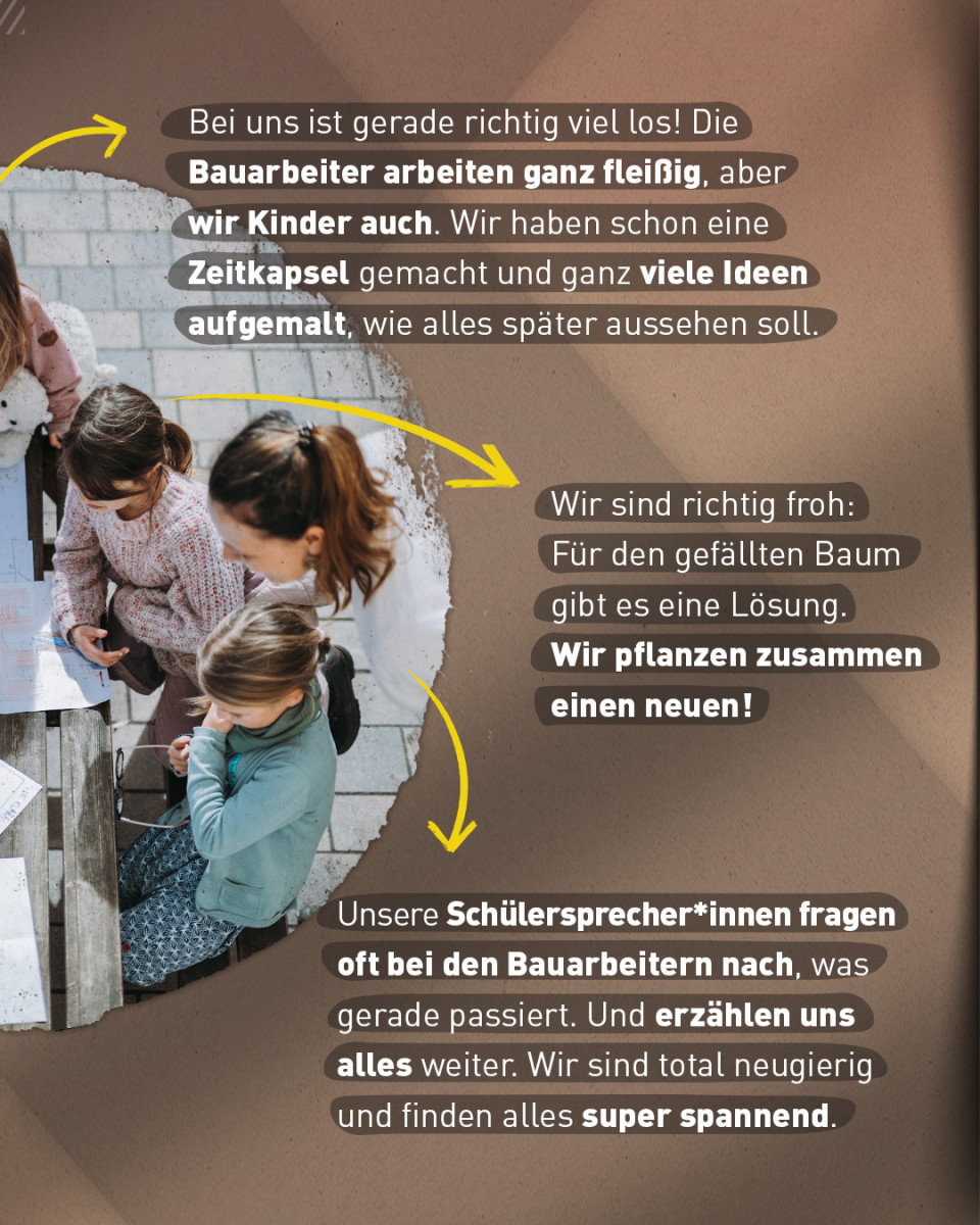 Aber nicht nur die Bauarbeiter haben aktuell fleißig zu tun in Lobeda. Auch die Kinder bringen sich ein. Sie haben z.B. schon eine Zeitkapsel zusammengestellt und Ideen zur Neugestaltung zu Papier gebracht. Und noch mehr Wünsche schwirren in ihren Köpfen herum: »Eine krasse Rutsche«, »Eine Seilbahn«, »Ein rieeeeesiges Klettergerüst«, »Eine Skaterbahn«, »Eine Rennbahn für Seifenkisten«, »Ein Trampolin«, »Eine Achterbahn«, »Ein Pool«. Glücklich sind sie darüber, dass zusammen mit der Schulleitung für den gefällten Baum eine Lösung gefunden wurde: Ein neuer Baum wird gemeinsam im Wald gepflanzt.