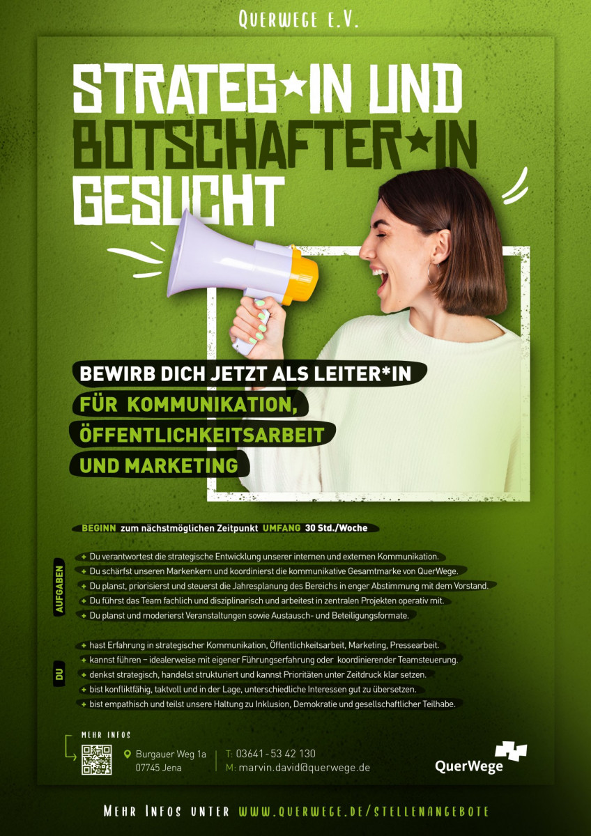 QuerWege e.V. ist ein inklusiver Träger in Jena. Wir gestalten Bedingungen dafür, dass Kinder und Jugendliche mit unterschiedlichen Voraussetzungen gemeinsam aufwachsen und lernen können. Für unseren Fachbereich Kommunikation, Öffentlichkeitsarbeit und Marketing suchen wir eine Führungsperson, die Markenführung, strategische Kommunikation, operative Öffentlichkeitsarbeit und ausgewählte Marketingaufgaben zusammenbringt.