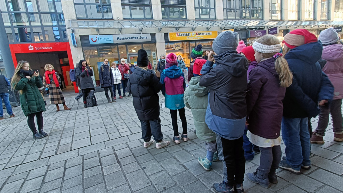 Im Juni 2023 fand eine sehr wertvolle Projektwoche »Hospiz macht Schule« mit Ehrenamtlichen des Hospiz Jena mit der Stammgruppe »Achate« statt, die trotz oder gerade wegen der »schweren« Themen Sterben und Tod großen Eindruck hinterlassen hat. Daher wollten die Achate unbedingt etwas zurückgeben. So beschlossen die 19 Kinder, im Dezember zu zwei öffentlichen Gelegenheiten Weihnachtslieder zu singen und dabei Spenden zu sammeln. Beim Weihnachtsmarkt des UKJ am 10. Dezember und am 15.12. in der Fußgängerzone der Innenstadt gaben Sie bekannte und moderne Weihnachtslieder zum Besten und zogen jeweils viele Zuhörer*innen an. Dafür hatten die Kinder viel geübt und das Ergebnis klang wunderbar! Der bereit gestellte Spendenhut füllte sich schnell, viele Zuhörer*innen blieben berührt und lange stehen.